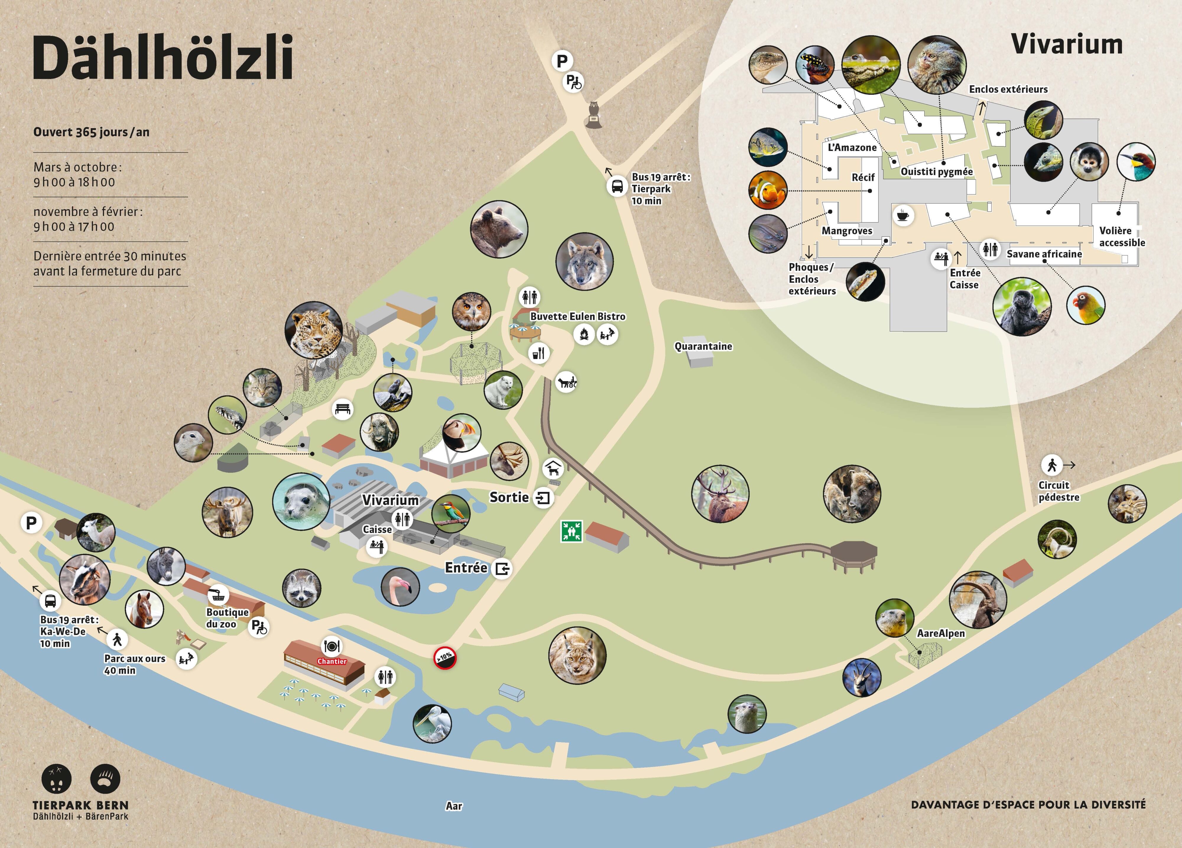 Vous cherchez la maison des macareux moines? Ou l’aquarium récifal de Berne? Le plan du zoo vous signale l’emplacement de la plupart des enclos du Dählhölzli, mais aussi où vous trouverez les toilettes, de quoi vous restaurer, des places de jeu et bien d’autres repères importants.