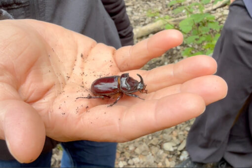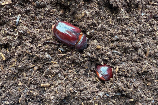 In diesem Jahr ist es so weit: Die Larven der ersten Zuchtgeneration haben ihren dreijährigen Entwicklungszyklus abgeschlossen und stehen kurz vor der Verpuppung. Das ist der richtige Zeitpunkt, um sie auszuwildern. Die angelegten Holzhaufen bieten den Larven einen idealen Standort für die Fertigentwicklung. Zusätzlich zu den Larven wurden in diesen Totholzhaufen auch adulte Käfer ausgewildert, die kurz vor der Paarung und der darauffolgenden Eiablage stehen. Damit soll erreicht werden, dass sich in den vorbereiteten Haufen neue Populationen entwickeln und etablieren können. Und es besteht die Hoffnung, dass ein Teil der adulten Nashornkäfer weiterfliegt und neue geeignete Lebensräume aufsucht, wodurch sich die Art weiterverbreitet. In Anwesenheit einer Vertreterin des Amts für Naturförderung des Kantons Bern (ANF) und Helfer*innen aus der Citizen Science Gruppe wurden insgesamt 40 Larven und 90 adulte Käfer an vier verschiedenen Standorten ausgesetzt.