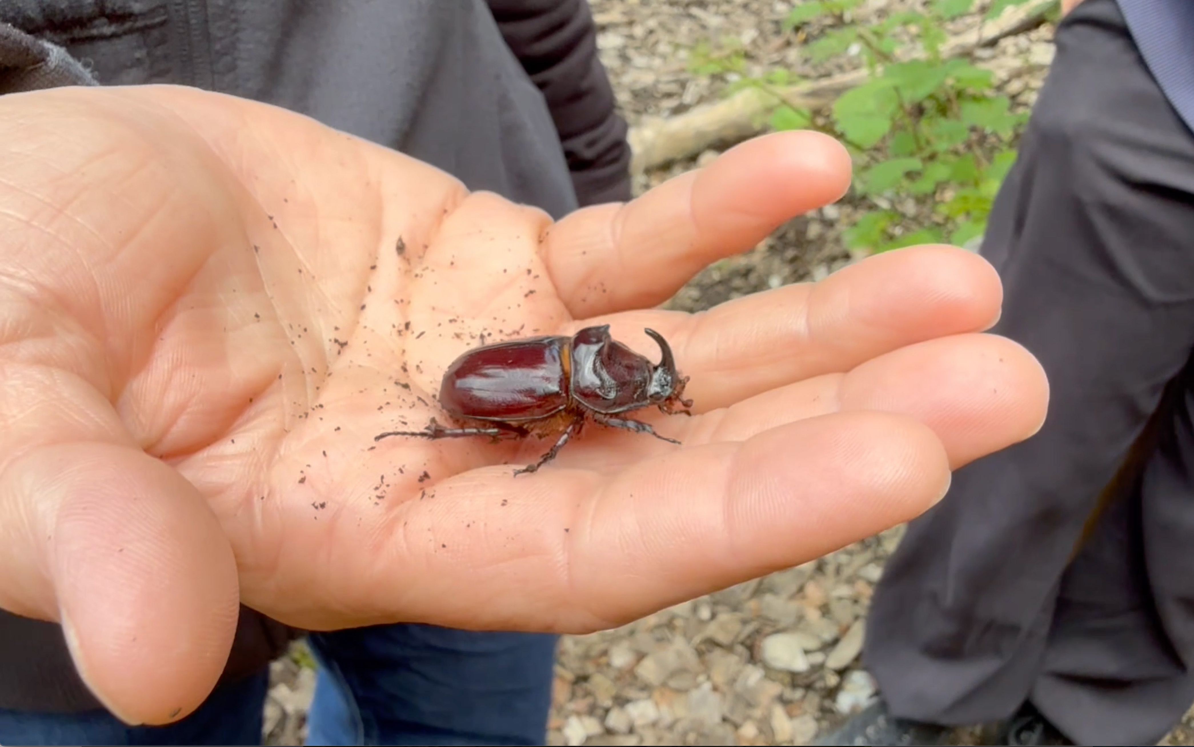 In diesem Jahr ist es so weit: Die Larven der ersten Zuchtgeneration haben ihren dreijährigen Entwicklungszyklus abgeschlossen und stehen kurz vor der Verpuppung. Das ist der richtige Zeitpunkt, um sie auszuwildern. Die angelegten Holzhaufen bieten den Larven einen idealen Standort für die Fertigentwicklung. Zusätzlich zu den Larven wurden in diesen Totholzhaufen auch adulte Käfer ausgewildert, die kurz vor der Paarung und der darauffolgenden Eiablage stehen. Damit soll erreicht werden, dass sich in den vorbereiteten Haufen neue Populationen entwickeln und etablieren können. Und es besteht die Hoffnung, dass ein Teil der adulten Nashornkäfer weiterfliegt und neue geeignete Lebensräume aufsucht, wodurch sich die Art weiterverbreitet. In Anwesenheit einer Vertreterin des Amts für Naturförderung des Kantons Bern (ANF) und Helfer*innen aus der Citizen Science Gruppe wurden insgesamt 40 Larven und 90 adulte Käfer an vier verschiedenen Standorten ausgesetzt.