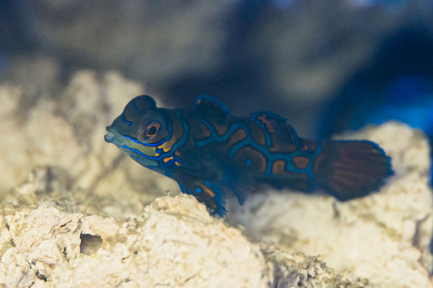Der Mandarinfisch wird bis zu 6-7 cm lang und ist ein Einzelgänger, der sich in einem festen, wenige Quadratmeter grossen Streifgebiet bewegt.