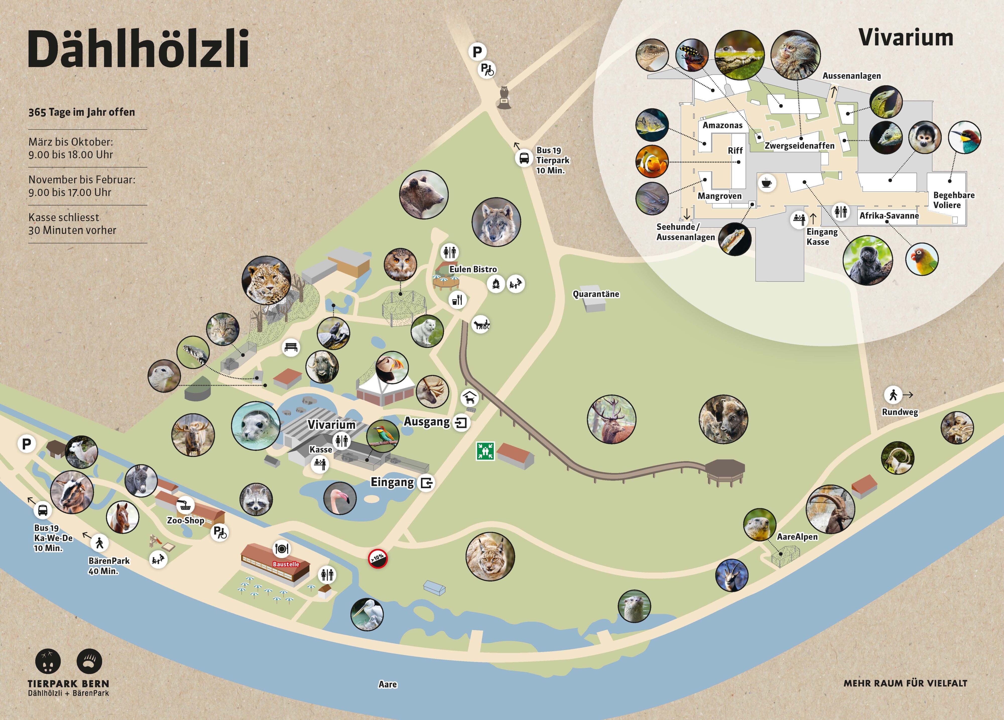 Suchen Sie die Papageitaucherhalle? Oder das Riff von Bern? Dem Zooplan entnehmen Sie die Lage der meisten Tieranlagen im Dählhölzli und wo Sie Toiletten, Verpflegung, Spielplätze und andere wichtige ‚Fixpunkte‘ finden.